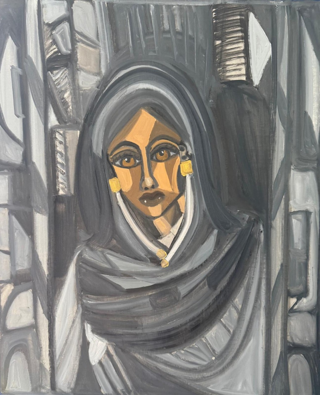 This painting beautifully embraces the Cubist style, depicting three women in a fragmented yet harmonious composition. The use of geometric patterns in earthy yellows, browns, and creams creates depth and rhythm across the canvas.