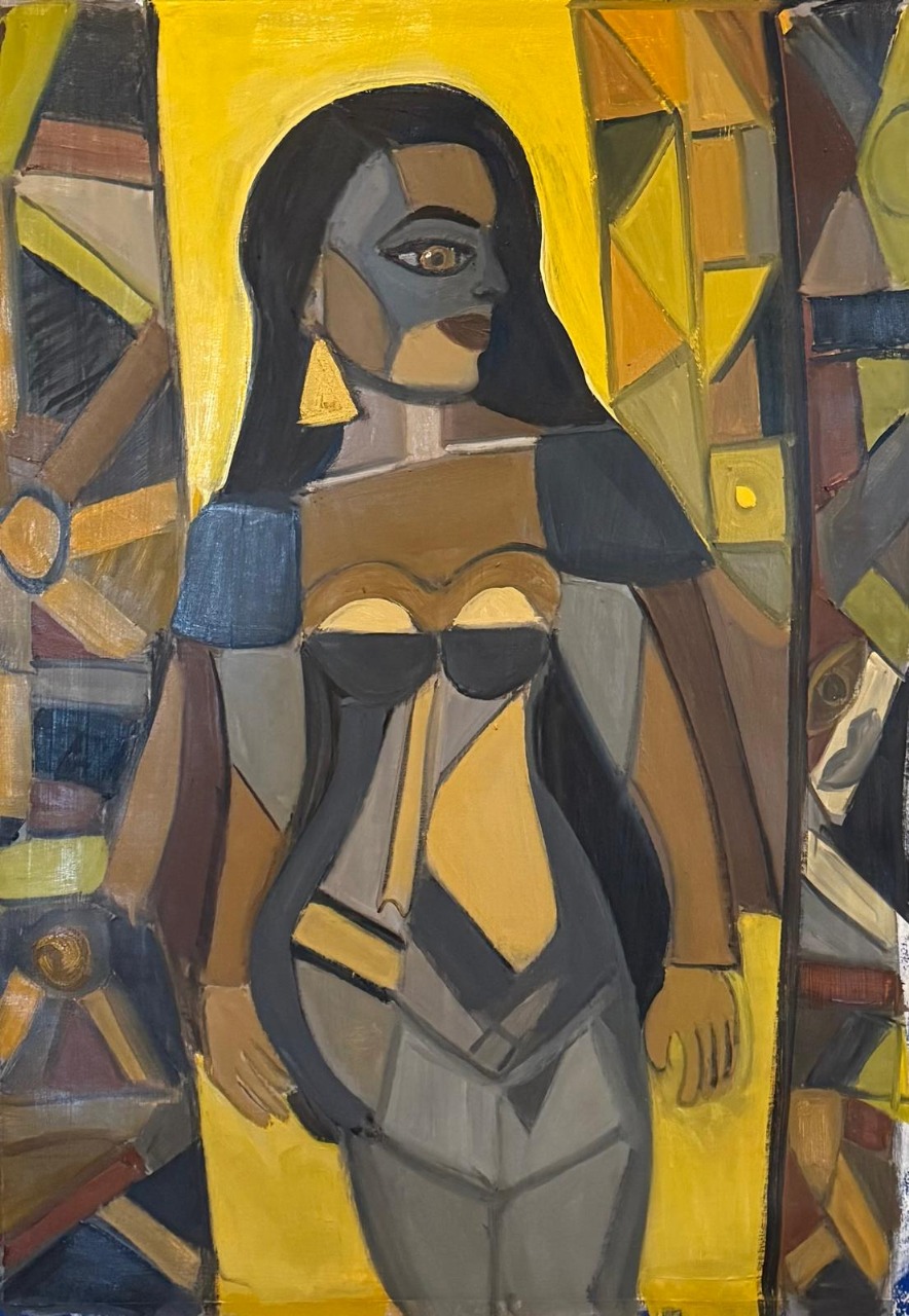 This painting beautifully embraces the Cubist style, depicting three women in a fragmented yet harmonious composition. The use of geometric patterns in earthy yellows, browns, and creams creates depth and rhythm across the canvas. Their bold eyes and defined features stand out, adding intensity and emotion to the figures. The repetition of shapes and tones emphasizes unity and balance while celebrating individuality.