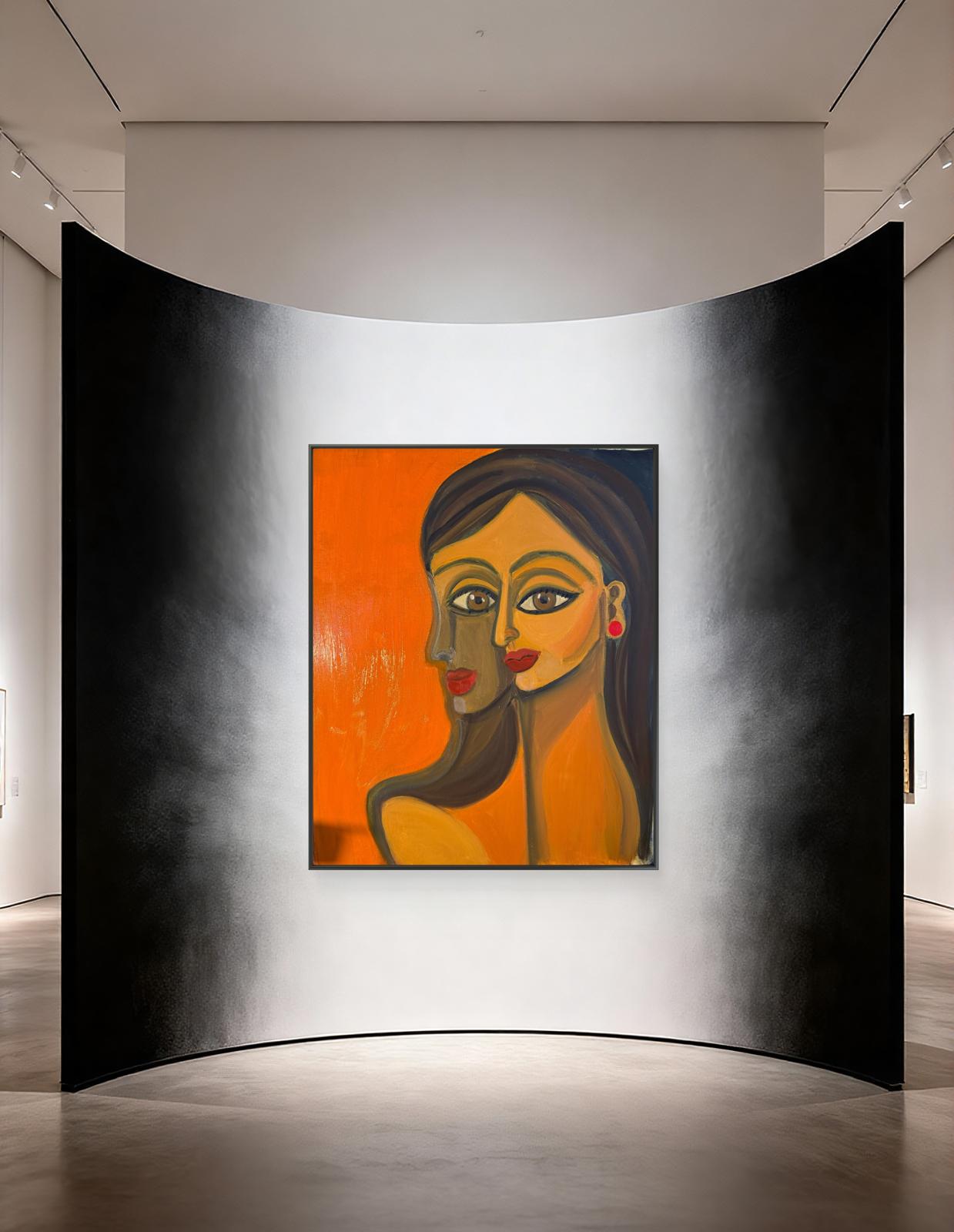 Two faces emerge from a single form, gazing in different directions yet sharing the same essence. The composition explores the quiet dialogue between the inner self and the outward persona. Warm tones of amber and burnt orange envelop the figure, symbolizing emotional warmth, memory, and introspection. The elongated neck and layered profiles evoke the influence of modern figurative Cubism, where identity is seen not from a single angle but from multiple emotional perspectives.